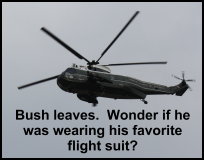 The crowd waved good-bye and cheered as Bush’s helicopter flew overhead, and sang na-na, hey-hey, good-bye. Our silver-ticket co-travellers barely made it through security. They were thrilled with their spots, even though they were so far away they really could not see anything on the stage.