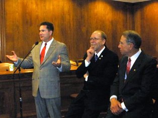 Congressman Bruce Braley takes a turn while Rep. Dave Loebsack and Sen. Chuck Grassley look on. I’m not sure what Braley was saying, but Loebsack seemed to find it humorous. The Dems were very welcoming and respectful to Grassley, the lone brave Republican.