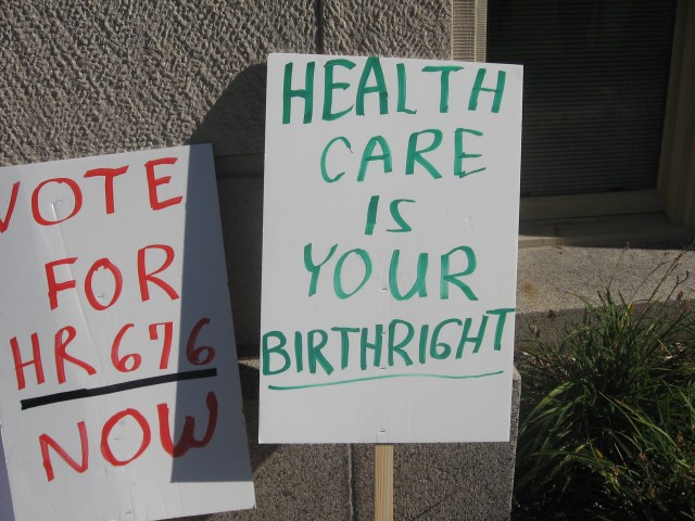 The Congressman received thunderous applause upon being introduced, and quite a few people stood. He opened with some remarks and, bless him, actually invited people to share comments, as well as ask questions. He gave a brief overview of the legislative process so far on health care. Holding a copy of HR 3200 up before the crowd, he said, “I voted for this bill,” to another round of enthusiastic and grateful applause. The Congressman shared a thumbnail version of the very basics of the bill. – If you are uninsured, you will have the opportunity to get insurance (applause).