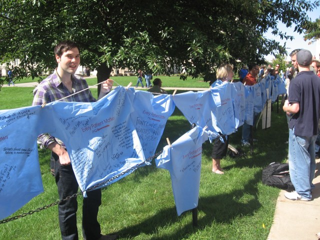 Note to conservatives: Please do not freak out, we were just joking. It's Iowa Citians' way of injecting humor into a “debate” that has begun to feel like one bad, long, headache.It was surprisingly quiet outside of McBride Hall before the start of the meeting. I saw two pro-healthcare groups. One group was for single payer, and the other group told me they were a group of UI health care workers, associated with SEIU. Faux hospital shirts with “Every Patient Matters” printed on the front, were hung on a clothesline, and anyone could go up and write their health care message on a shirt. The plan is to collect as many shirts as possible with the messages, and deliver them to Grassley. The person I spoke with, Bradley Vanwaus, had a simple message: “Every day, hospital workers see patients without insurance.”