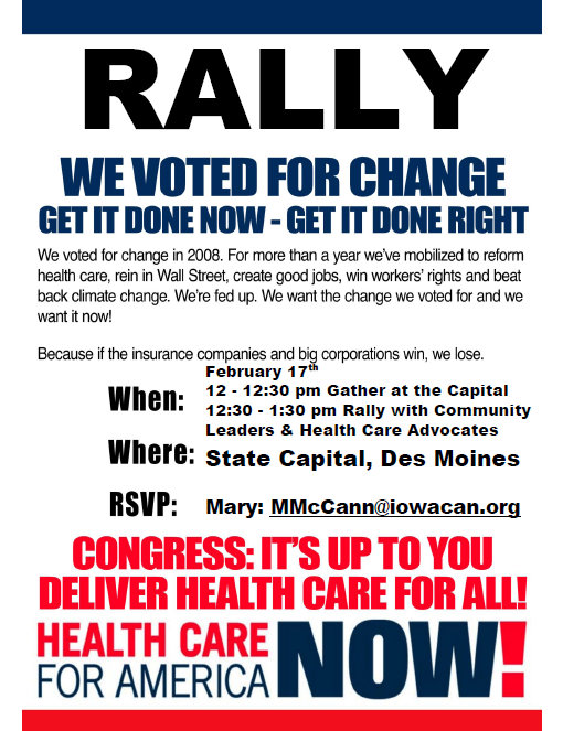 Our friends at Iowa Citizens Action Network wanted us to pass along this flyer regarding a rally on health care in Des Moines on Wednesday, February 17th. If you have any questions, contact Mary McCann at mmccann@iowacan.org