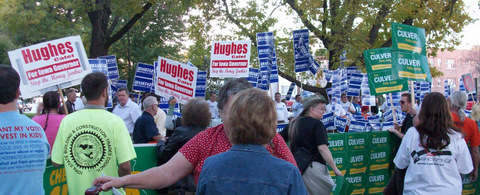 On the way in, the campaign supporters were loud and rowdy…the Republicans were pounding on what looked like red paint buckets…they were chanting something, couldn't hear, but it seemed to us that the Culver supporters were louder, we could hear “Terry loves taxes” to the tune of “here we go Hawkeyes, here we go!” Quite a few black and gold “Hawkeyes for Culver” shirts…people wanting to know where to get them…