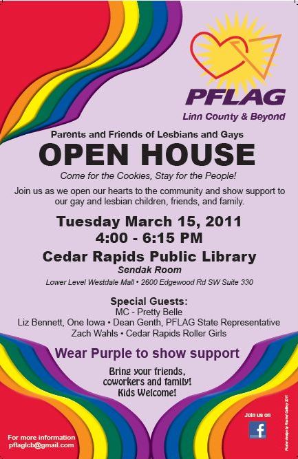 We at PFLAG Linn County & Beyond appreciate this posting and publicity for the open house. The turn out was fantastic. We learned many things, visited and celebrated.