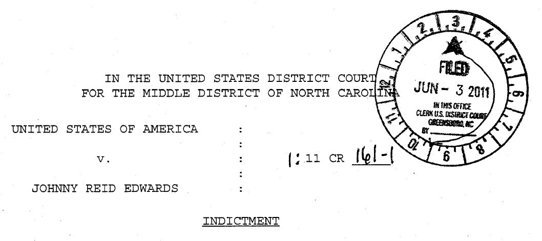 On Friday, June 3, John Edwards, the former North Carolina Senator and two time presidential candidate, was indicted by a federal grand jury on charges of conspiracy, illegal campaign fund usage and making false statements. Click here to read the indictment. Edwards plead not guilty that day.