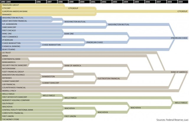 You’ll notice that in the late 1990s and early 2000s, when most of the consolidation began, it coincides with the 1999 Gramm-Leach-Bliley Act, which repealed the 1933 Glass-Steagall Act. That act allowed financial institutions to be commercial banks, investment banks and insurance companies under one entity, with the theory that the banks would be too big to fail. So much for that.