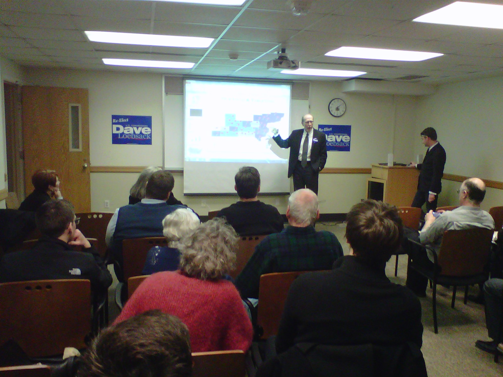The Indiana Room was full, probably 40 or 50 people in attendance. Loebsack filled the time waiting for Israel to arrive chatting with students, answering questions and talking about the new district. A couple of the new counties were in King’s district and rumor has it they are so ready for a new congressman.