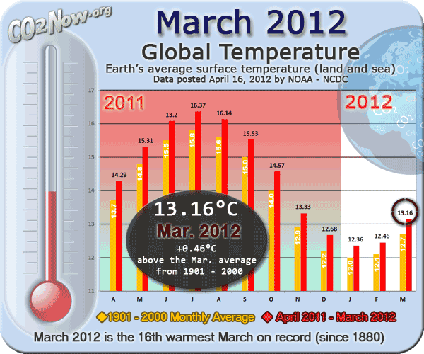 May 2011 to April 2012 has officially become the hottest 12 rolling month period ever in recorded temperature history ever. The current level of CO2 in the earth’s atmosphere is 396.18 ppm, well over the 350 ppm that is the upper limit for safety. At what point will our government start reacting to this huge crisis?