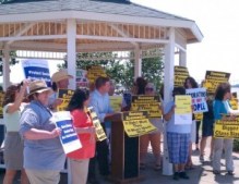 I went down to join Progressive Iowa and local Quad Citians protesting the appearance of Willard Milton Romney in Davenport today. About 30 citizens showed up, but of course in this land of free speech we were so far removed from where the actual event would take place that no one aside from TV cameras could see us.