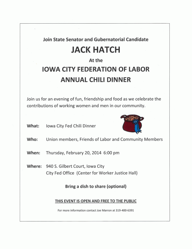 Democratic State Senator and gubernatorial candidate Jack Hatch (District 17) will speak at the Iowa City Federation of Labor Annual Chili Dinner.