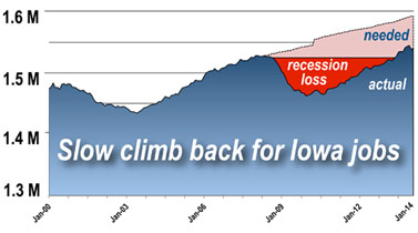 The graph below represents the more appropriate alternative to job counting that we have encouraged Iowans, including the Governor, to consider. Provided by the well-respected Economic Policy Institute, this measure looks at net job change dating back to 2000. It shows where jobs dropped in our state during the last recession (red area), and shows how many jobs we are short given the increase in population since the recession began.