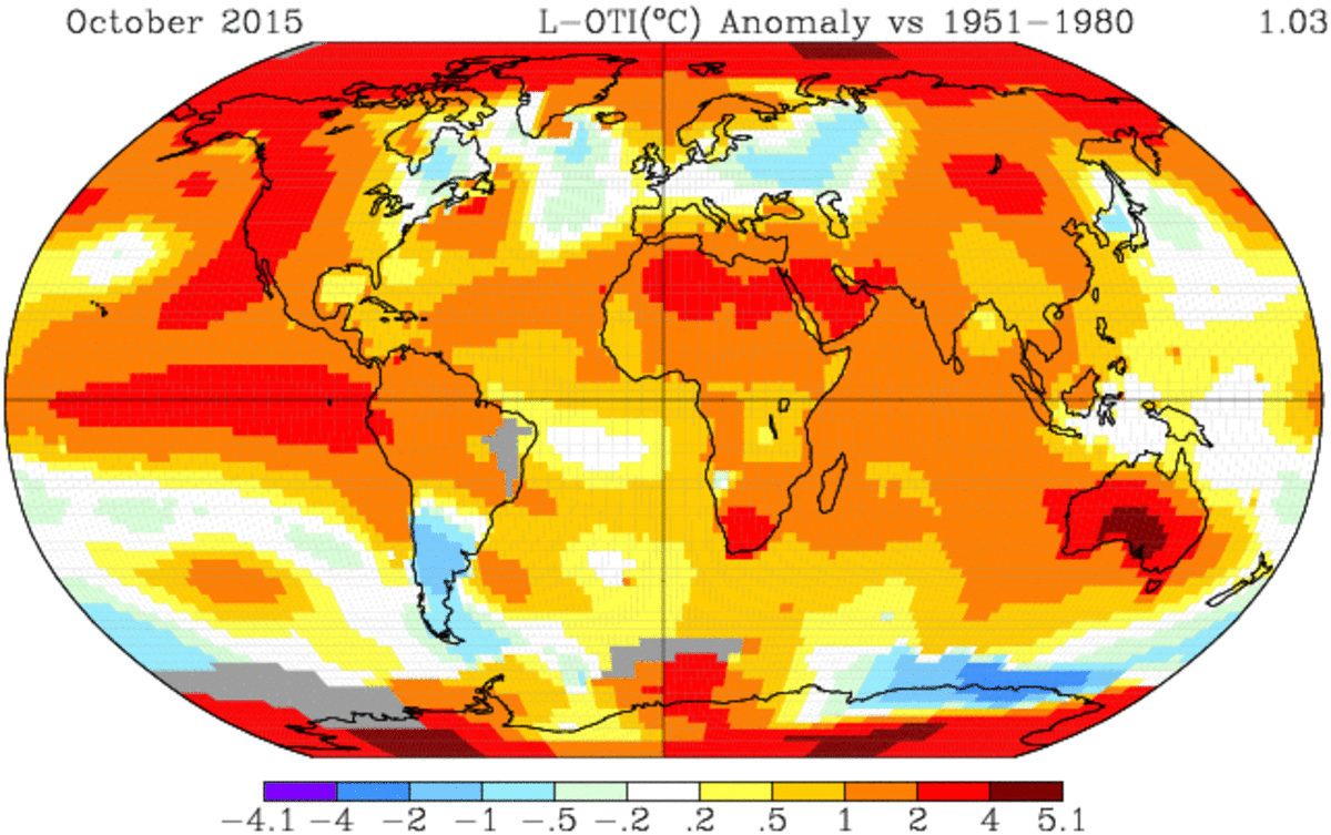 A map of temperature anomalies during October. Red shows the biggest deviation from the standard (temperatures recorded between 1951 and 1980).