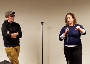 Kate Revaux (left) and Monica Biddix at the Iowa Democratic Party Building Blocks Listening Tour March 7, 2017 in Coralville
