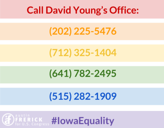 It’s one thing for your representative to disagree with you, but the idea that David Young claims to speak for the citizens of the Third District while telling gay and lesbian couples they should not be guaranteed the right to be in a legally-binding committed and loving relationship just isn’t Iowa nice. The Third District deserves a representative who will treat constituents the way you’d like to be treated — with decency and respect.