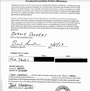 “I am a member of the Democratic Party,” the document signed by Sanders reads. “I will run as a Democrat, accept the nomination of my Party, and I will serve as a Democrat if elected.”