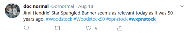 There were breaks in the broadcast and WXPN used this time to play songs from 1969 so you never had to be jolted back and forth between being at Woodstock and being in our current Trump-opia reality.