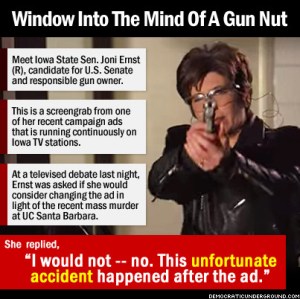 In a speech on the senate floor last week, Joni did what Republicans always do when they’re doing something wrong. She blamed Democrats. Joni Ernst can’t bring herself to displease the NRA and support a bill that would restrict gun ownership for abusers even though she has said that she is a victim of sexual assault herself and has pledged to make VAWA (Violence Against Women Act) a priority. Wow.
