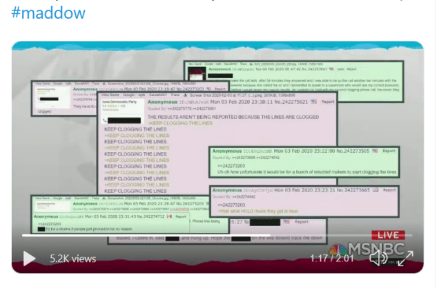 Maddow reports, “NBC News and other news organizations tracked down messages from pro-Trump political message boards showing Trump supporters in real time on caucus night posting and reposting the hotline numbers for precinct chairs and encouraging others to “F” them up and to “keep clogging the lines.”