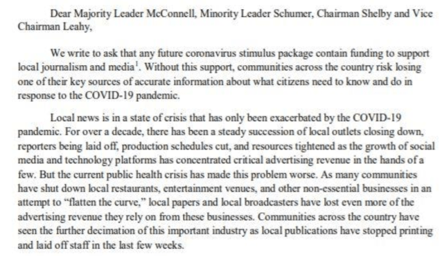 More than a dozen senators are calling for any future stimulus package addressing the economic fallout from the novel coronavirus to include funding for local journalism, saying that communities across the U.S. are at risk of losing their source of news because of the pandemic.