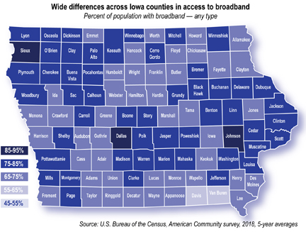 “Overall, 21.2 percent of Iowa’s residents lack a broadband subscription, even with mobile access included, according to the most recent Bureau of the Census data (American Community Survey 2018, five-year averages).”
