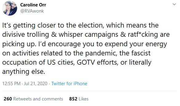 During the election campaign, the Republican online goal is to disrupt people using internet applications to build bonds among real people in opposition to the president and his enablers. Chaos and confusion? Don’t get sucked into it by asserting a correction or condemnation to trolls. They want to distract you any way they can. Feeding the trolls with your attention serves their purpose, not ours. According to historian Michael Beschloss FDR said during the World War II national effort, “Lost ground can always be regained – lost time never!” 103 days from Nov. 3 we have no time to spare with trolls or other Republican sourced intended distractions.