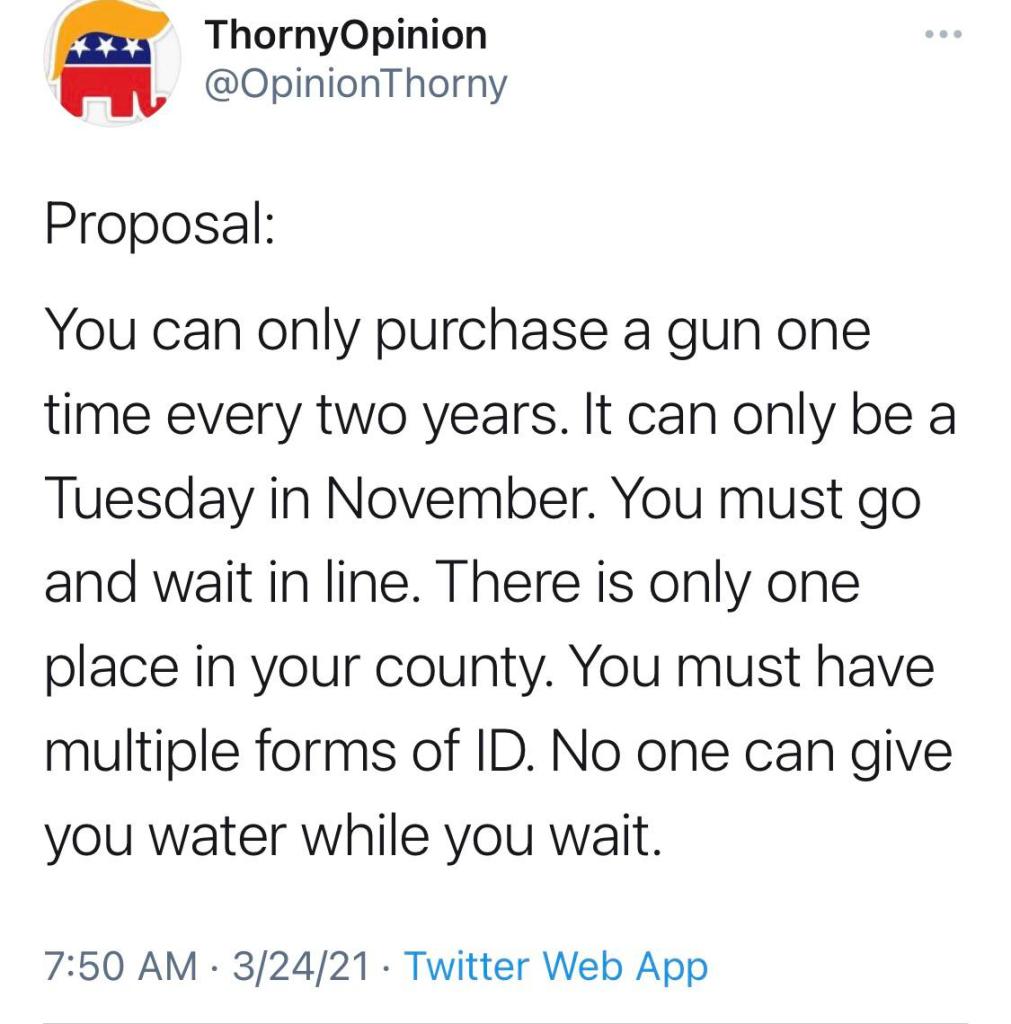 Here is one suggestion that melds voter suppression with gun laws: