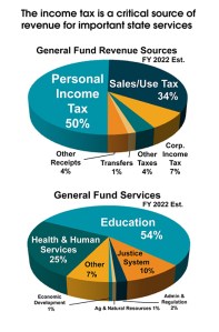 Big new tax cuts would decimate critical services for Iowans. The personal income tax generates half of Iowa’s general fund, which pays for the services supporting Iowa families, workers and their communities (chart, right). Making large new cuts to the income tax, let alone eliminating it, would force draconian cuts or even elimination of entire service areas. If lawmakers wanted to hold revenues even, they would need to approve an offsetting tax increase — and the sales tax is the only existing option. State and local sales taxes, now 7 percent in most of Iowa, would spike to 15 percent to fully replace the income tax.2