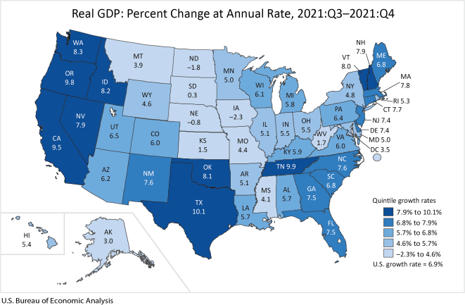 Real gross domestic product (GDP) increased in 47 states and the District of Columbia in the fourth quarter of 2021, as real GDP for the nation increased at an annual rate of 6.9 percent, according to statistics released today by the U.S. Bureau of Economic Analysis. The percent change in real GDP in the fourth quarter ranged from 10.1 percent in Texas to –2.3 percent in Iowa (table 1).