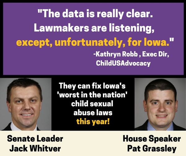 Sign the petition to fix Iowa’s failing child sex abuse laws. And then tell Iowa Republican state legislators to fix Iowa’s “worst in the nation” child sex abuse laws” BEFORE the 2022 session ends.