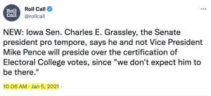 On January 5th, Chuck Grassley told reporters that he – not Mike Pence – would preside over the certification of the Electoral College votes. Grassley said of Pence: “We don’t expect him to be there.”