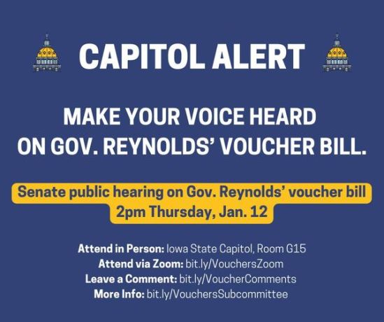 The Iowa Senate will hold a hearing tomorrow afternoon to hear what Iowans think of school vouchers. This is your chance to tell lawmakers to stop this attack on Iowa’s public schools.