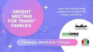 I am writing to you with a heavy heart. Today SF 538 passed the House, and it cleared the Senate yesterday, making it set to arrive at the governor’s desk anytime. We know that gender-affirming care saves lives, but the extreme wing of the Republican party was not willing to back down from their agenda to harm LGBTQ youth in Iowa.