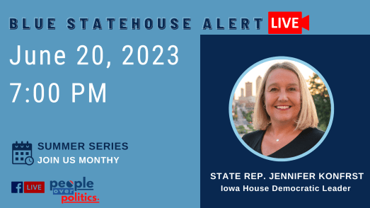 Join House Democratic Leader Jennifer Konfrst for her first Blue Statehouse Alert Live of the summer on June 20, 2023 at 7pm. We’ll be talking about the big Iowa Supreme Court ruling and what might come next.