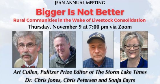 ART CULLEN, Pulitzer Prize-winning editor of The Storm Lake Times, headlines a compelling panel of experts, farmers, and neighbors to take a hard look at how livestock consolidation impacts rural America. The JFAN Annual Meeting, “Bigger is Not Better: Rural Communities In the Wake of Livestock Consolidation.”
