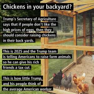 Has it ever even occurred to Brooke Rollins that the people who are least able to afford the price of eggs tend to also be people who are unlikely to have their own backyards at all, let alone the time and money needed to raise chickens? But what kind of thinking can one expect from someone who thinks human-caused climate change doesn’t exist. Duh-wuhhh.