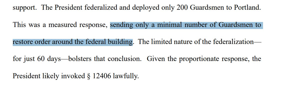 Sunday night, we discussed Trump’s plans to use the National Guard for domestic law enforcement purposes and the Seventh Circuit’s decision that he could not deploy them to Chicago. Monday, the Ninth Circuit’s decision, as expected after oral argument, went the other way, holding that Trump’s plan to deploy the Guard to Portland was lawful. The decision was 2-1. The majority ruled that sending 200 troops to protect the federal building for 60 days was a “proportional response” to the crime issues Trump believes exist in the city.