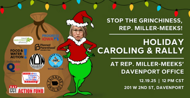 Stop the Grinchiness! From our friends at Progress Iowa: “Join us Friday, December 19, at noon outside Rep. Mariannette Miller-Meeks’ Davenport office (201 W 2nd St, Davenport) for a festive holiday gathering to call out Rep. Miller-Meeks’ year of grinchy behavior! We’ll be outside her office for 30–45 minutes with speakers, caroling, and plenty of holiday spirit as we welcome Rep. Miller-Meeks back to Iowa after a year of downright Grinchy behavior. Bring your favorite Grinch-themed signs and festive attire.”