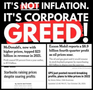 We note that inflation is high, but the Administration has had little to do with causing the problem. It is world wide and much of it due to corporate greed and problems caused by the bad response to the original waves of covid.