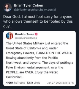 We have come to expect that people in politics (Democrats anyway) have learned to do due diligence before espousing an action. Donold Trump (or as I like to call him Stinky Pants) never has. Didn’t in his first term, ain’t doing so now and refuses to listen to anyone who in any way disagrees with him. He doesn’t care who gets burned.